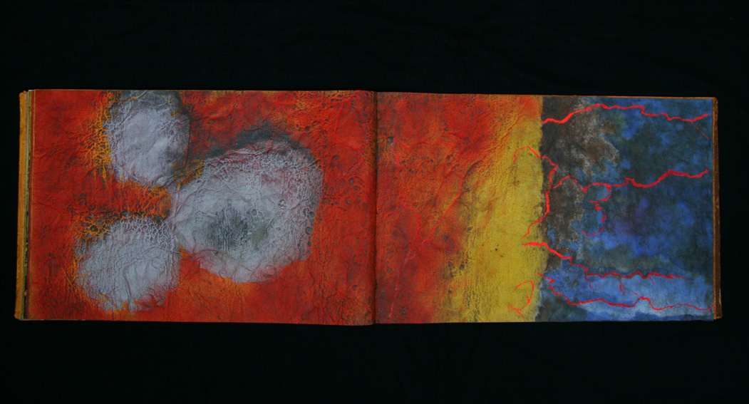 Booklyn Artists Alliance, the collective group of artists that created this book, describes Venus as a, “one-of-a-kind artist’s book made from Korean mulberry and cellulose paper, acrylic paints, pencil, walnut ink, Japanese black ink, human blood, turmeric and cayenne pigment suspended in Polyvinyl Acrylic, graphite dust painting, and other media. Techniques include body printing, aspiration, xlene graphite transfer, and multiple layering of media. The bark on the covers comes from a Prunus virginianum (chokecherry) that Kurt cut down for firewood in upstate New York.
