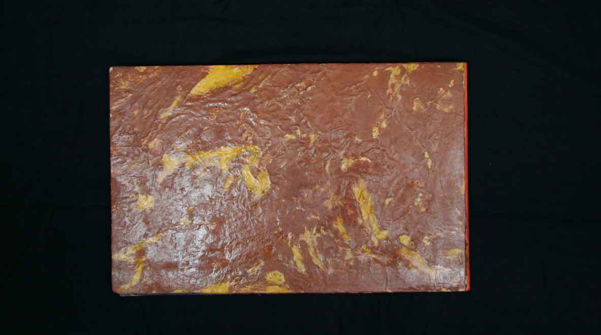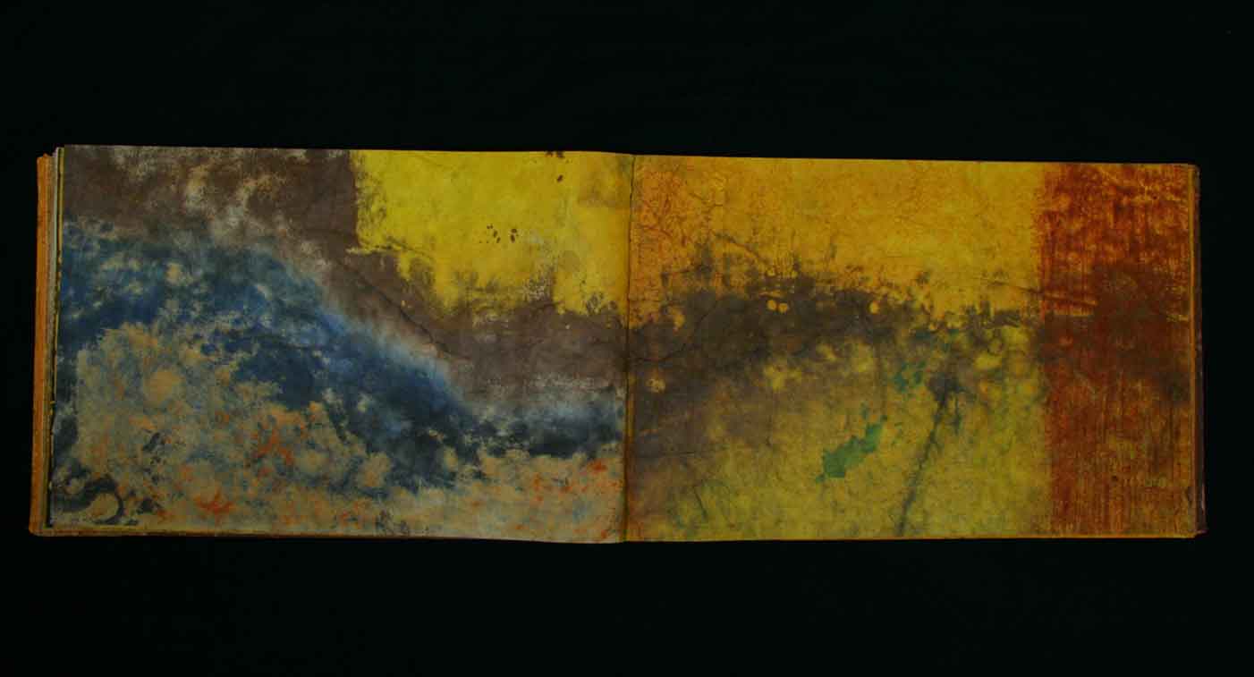 The original pages for this book appeared as wall paintings in Organik’s ‘Spice Cave’ at Gallery Andante in Seoul Korea in 2008. Thick layers of impasto turmeric and cayenne pigment suspended in Polyvinyl Acrylic were layered onto the sheets. A few months later the large sheets were returned to Organik’s studio in Brooklyn and they were torn down into page size sheets. Then over the course of a year, after much research on the geography of the planet Venus, (primarily through recent NASA satellite photography) and much consideration over an epic love poem to the planet written by Weber, the collaborators painted collectively on the sheets in weekly and bi-weekly studio meetings.” With all of the spices incorporated into the production of Venus, it’s definitely a book that appeals to all the senses.