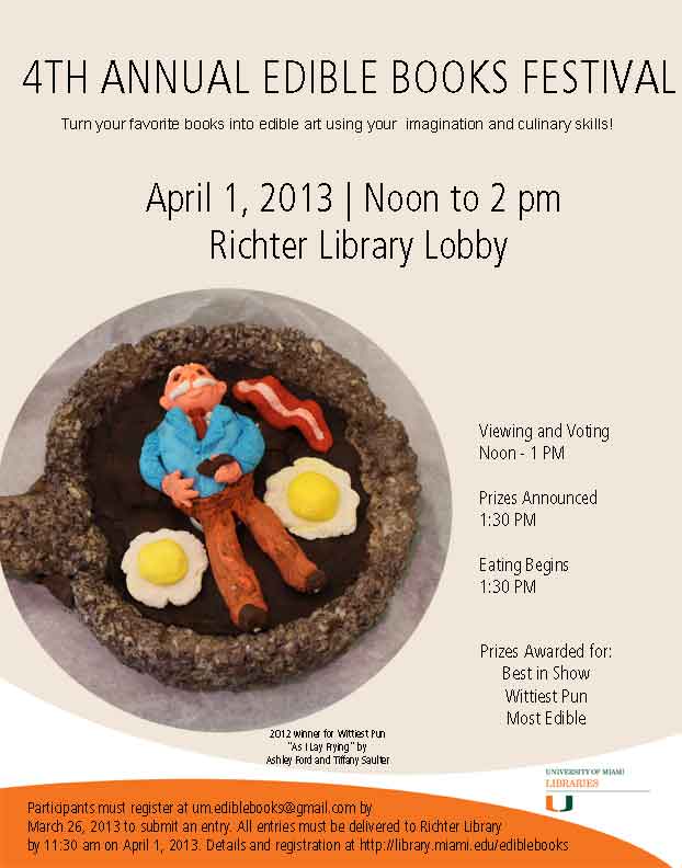 We are excited to announce the 4th annual Edible Books Festival at the University of Miami Libraries. This year’s festival takes place on April 1, 2013, in the front lobby of the Otto G. Richter Library at 12:00PM.