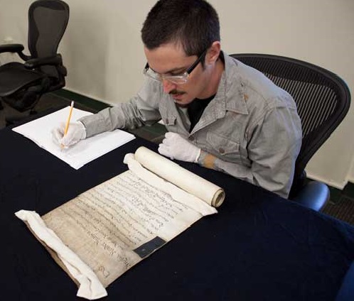 As with handling any manuscript, reading isn’t the only time you should be supremely careful. You should always return the materials in the exact state in which you received them. To do so, the 18th century scroll needed to be tightly rolled back up, wrapped with acetate rolls on its ends to hold it in place and returned to the box built for it by the bookseller. Strangely, after being out in the air of Special Collections, the manuscript expanded to the point of not fitting within the acetate provided. Vellum’s sensitivity to the elements is impressive and one can’t help but think that perhaps the estimable scroll is yearning to return to its natural sheep sized form. It is equally obvious why, and a shame that Vellum is not used anymore.