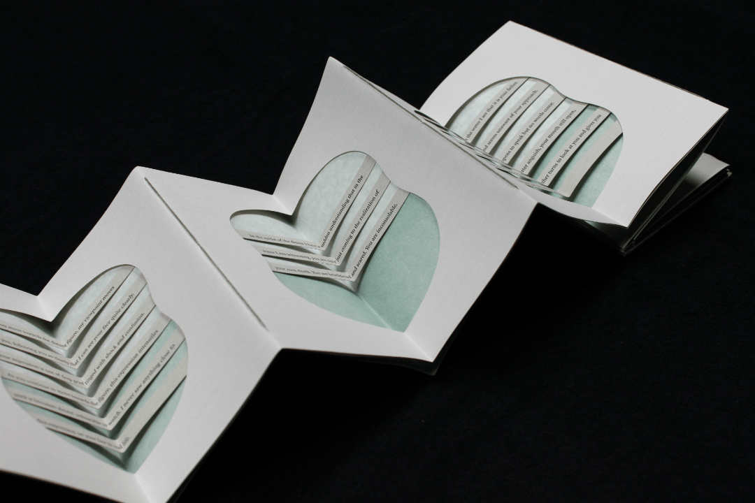 Encased in cloth with a magnetic enclosure, the book can be opened up to reveal the piercing statement that serves as a centerpiece for her work, “We dream the answers before we ask the questions.” Those words loom over each new compartment, revealing different stages of a dream as though the reader is walking through it and exploring an imaginary landscape. A window lies hidden behind the text, offering a peaceful, three-dimensional glimpse of trees grouped together near water. As the reader explores even further, two well-crafted booklets bound together and tucked in their own compartments can be found, describing the journey into the dream with vivid image-laden phrases right up until “The dream comes to an end and I wake with an overwhelming sense of longing for something that I cannot name or comprehend.”