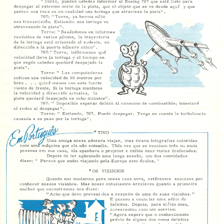 The publication also sought to enrich the readers’ general knowledge of the world and provide amusing tidbits to share with others. One anecdote discusses the absurdities in French grammar by detailing how items are not only arbitrarily categorized as masculine or feminine, but there are words that fall into neither category, such as the French word “livre,” a homonym that behaves like a masculine noun when it means “book” and a feminine noun when it means “pound” or indicates the old form of French currency. Another humorous anecdote in Spanish tells the story of a plane trying to take off but running into trouble because there is a turtle slowly moving across the track. The sheer variety of languages indicates how multicultural their staff was and demonstrates Pan Am’s commitment to globalization.