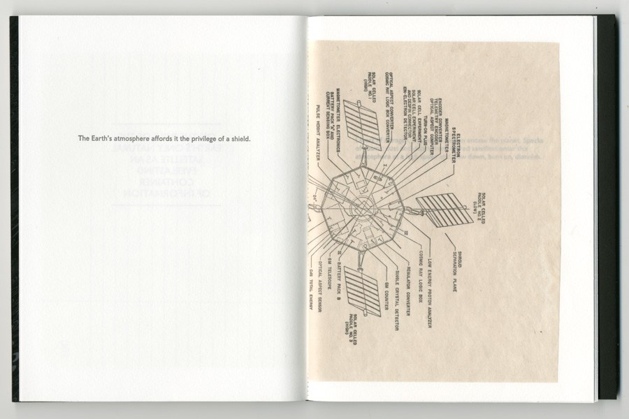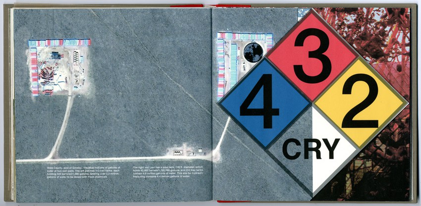 On the outside, 4 3 2 CRY mimics the condensate tanks along Colorado’s horizon, each book wrapped in drab book cloth with an actual aluminum NFPA hazard diamond riveted onto its cover. On the inside, 4 3 2 CRY‘s 48 pages are packed with visual and textual information: satellite maps, personal photographs, screenshots from websites, scrawled handwritten annotations, and technical text and narrative poetry are digitally juxtaposed to create rich surfaces and textures. Aerial maps of the drilled earth’s terrain create strikingly abstract, patterned compositions decoded by Kathy’s text. – description from Women’s Studio Workshop