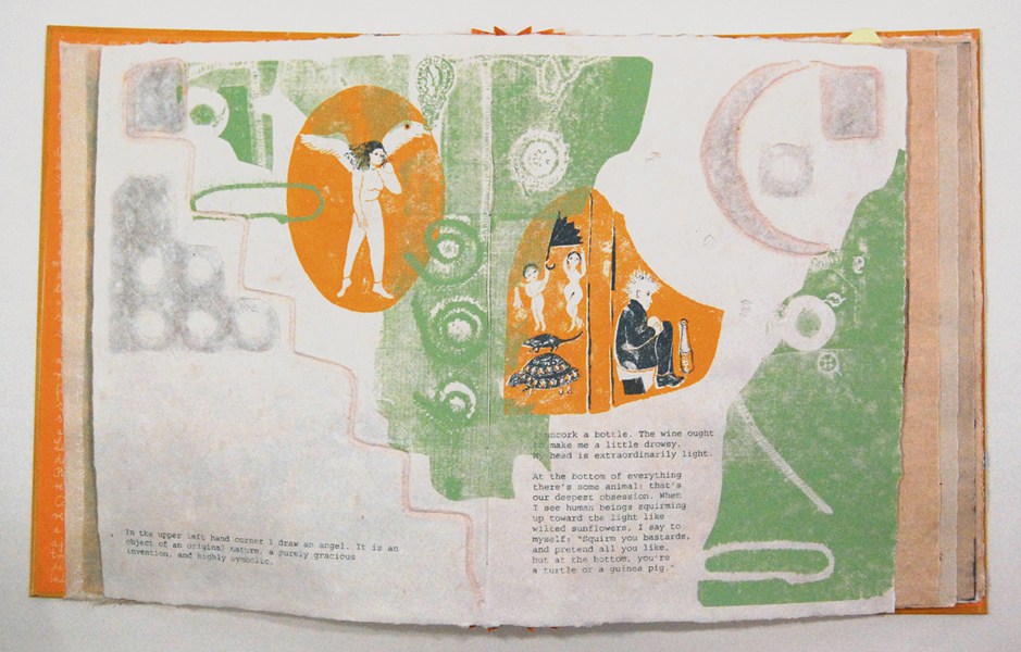 “Inspired by Henry Miller’s story The Angel is My Watermark and a 17th century poem the Song of Paper by Father Imberdis, the artist meditates on the emancipation of the watermark. Handmade paper with rich texture, colorful etchings, embossings and silkscreened text accompany the elaborate watermarking process. Accordion bound in hard covers.” – Women’s Studio Workshop