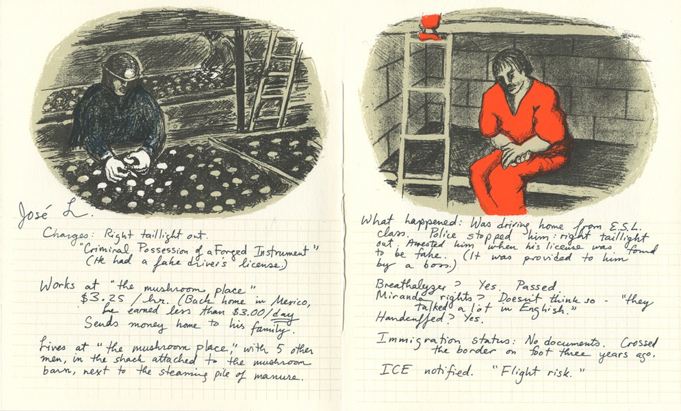 “Stories Behind Bars was inspired by the author’s job as a Spanish interpreter in the US courts. It consists of four individually bound silkscreen printed booklets: in one, a young man is deported using video teleconferencing, another gives some brief history of immigration detention, and all tell stories of immigrants in U.S. prisons and jails. The stories give the reader an insight into the complex issues surrounding the immigration debate. The four separate pamphlets are housed in a slipcase with a barred window. Silkscreen printed.” – Women’s Studio Workshop