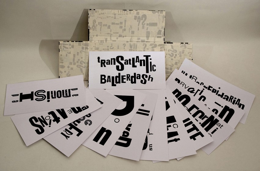 “Transatlantic Balderdash is a series of cards, not unlike flash cards, that feature the ‘big words’ used in Errors of the Amanuensis. The 25 words, from admonish to ultracrepidarian, are printed using a random selection from the over 3,000 type fonts available for KakeArt to use during their residency at the Hessischisse Landes Museum fur Industrie und Kultur in Darmstadt, Germany. The cards were shown to a group of Germans and Americans asking each group to define the word. On the back of each card are their responses and the correct definitions.” – Women’s Studio Workshop