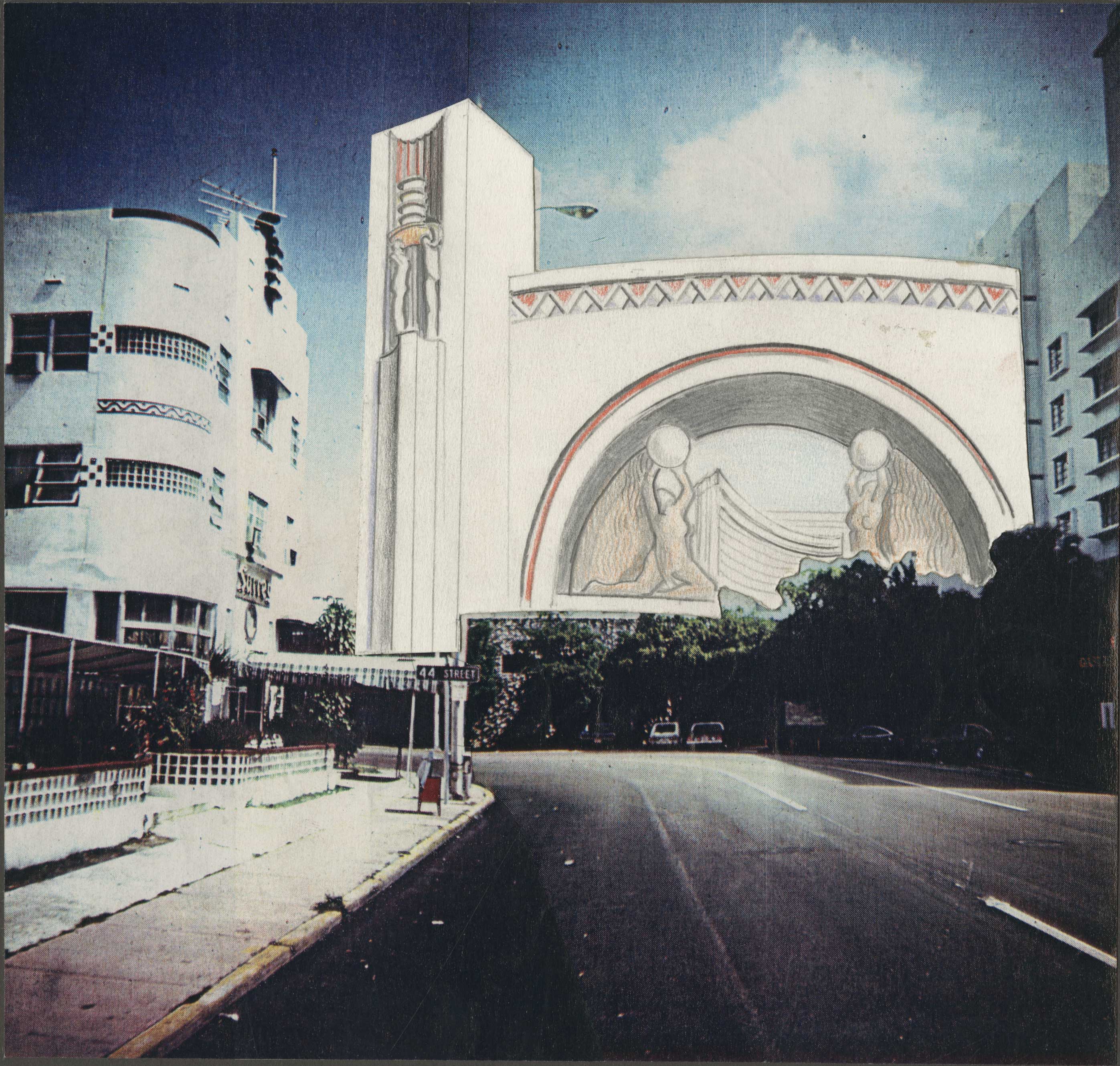 The mural—which stood from 1986-2003—was remarkable; two Art Nouveau style stanchions flank the main image of the Fontainebleau Hotel, itself inspired by the stylings of Finnish architect Gottlieb Eliel Saarinen, father of the famed architect and industrial designer Eero Saarinen. On top are two native birds intertwined with local foliage. The intention is to frame the image of the original hotel, standing firm as guardians of the opening, which by precise detail brings the Lapidus building through a six-story wall. Its lush pool invites the viewer to paradise. The mural itself stood as a striking unity of architecture and art, mischievously showing the hotel behind the hotel. Haas explains that the building “needed a dramatic opening” and then jokes that it was “very hard to come upon the original Lapidus building as you’re driving” because the view is obstructed. So he opened up the wall.
