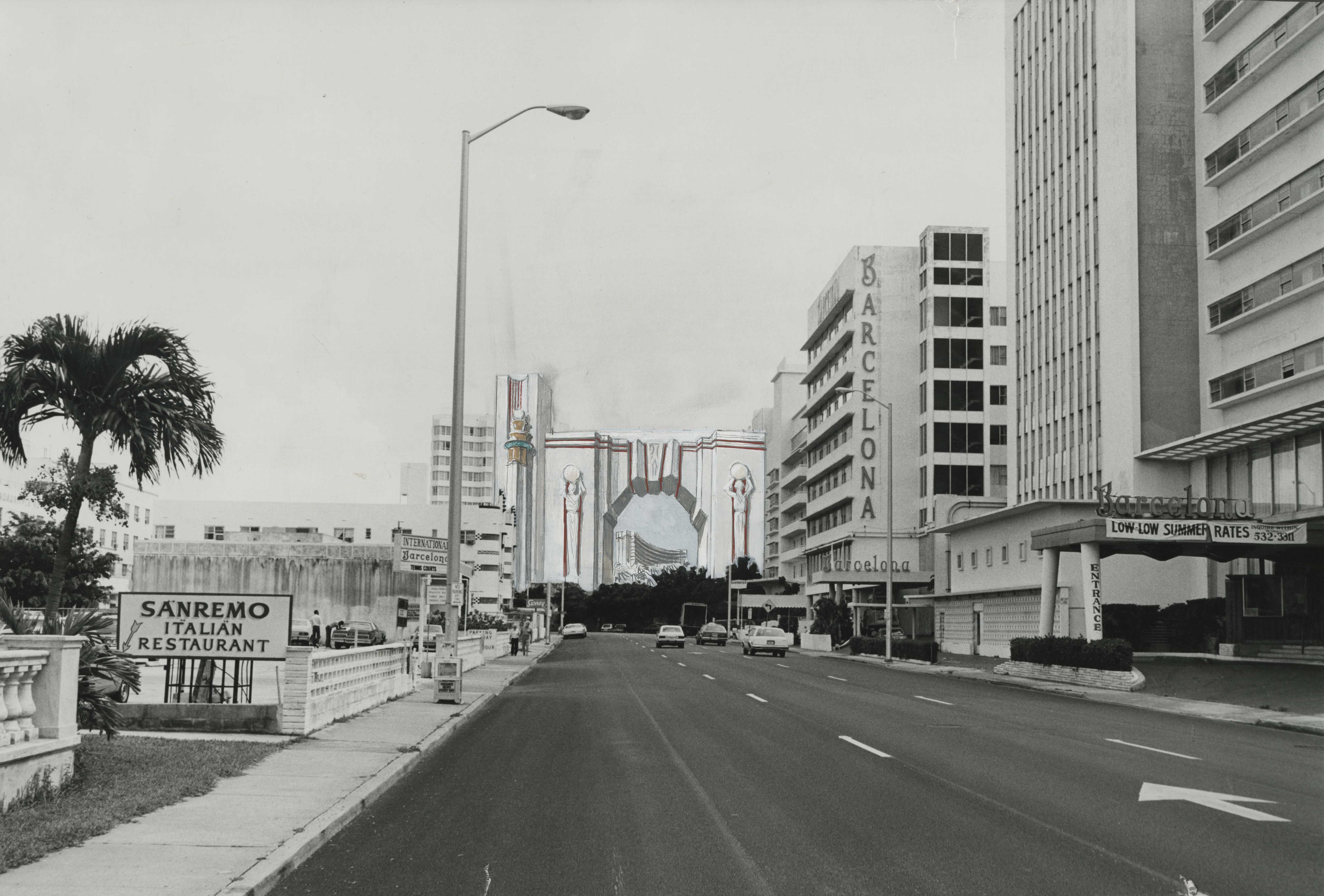 Miami Beach isn’t historically known for its iconic public art, but for nearly twenty years, a beloved 13,000 square foot, six-story trompe l’oeil mural allowed passersby to take an illusionary peek inside the Morris Lapidus designed Fontainebleau Hotel. The mural figuratively opened up the supplemental building that was obstructing the original hotel at the time. That work is still remembered fondly amongst Miami Beach natives and visitors from the old school. Some still lament the decision to tear down the building with the mural, as Head of Special Collections Cristina Favretto explains, “Miami’s skyline changes at a vertiginous pace. Buildings appear and disappear almost overnight. Sometimes the change is good, and sometimes it most definitely is not.” She goes on to explain that, “the destruction of the Haas mural is not only in the ‘not good’ side of the story, but in the ‘what were they thinking?’ side.”