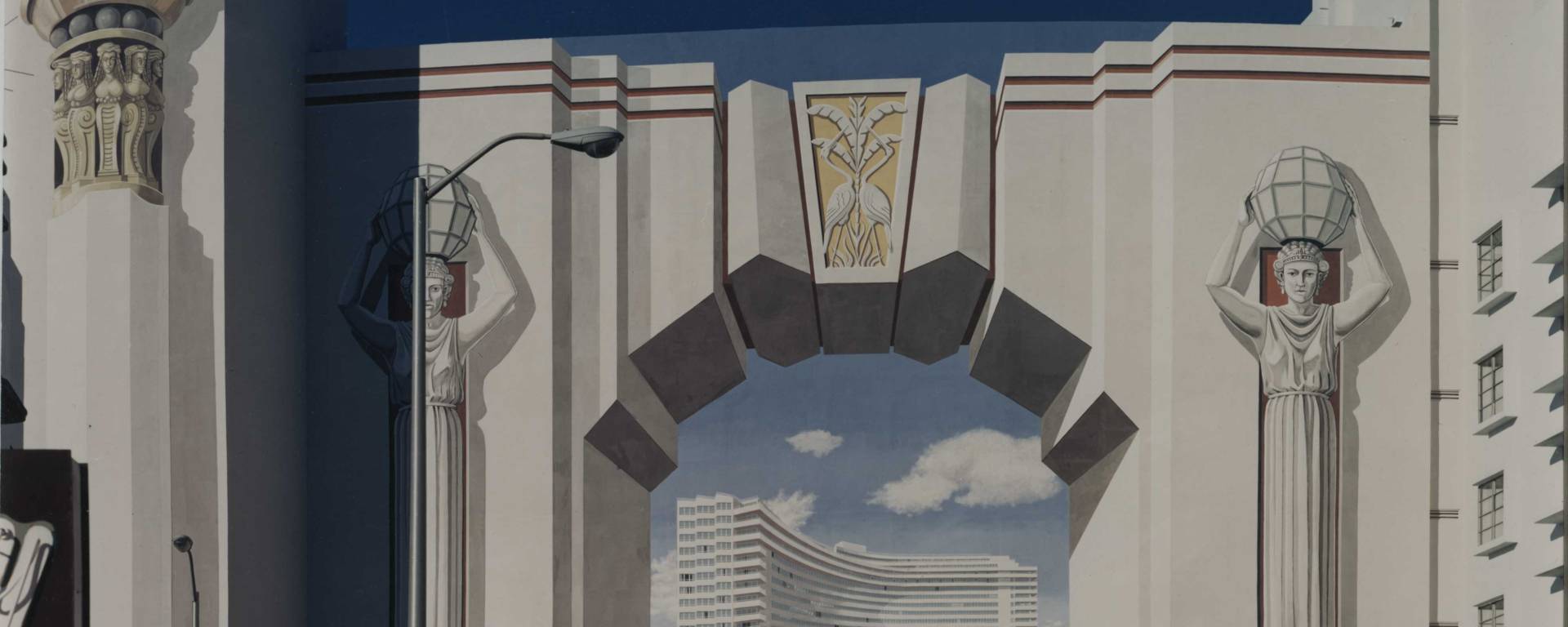 Richard Haas (b. 1936) has a decades-long and much-celebrated career of architectural murals. A 2005 book on his work entitled The Prints of Richard Haas 1970-2004, describes his work as “depicting in painstaking detail the physiognomy of particular buildings,” and later, “a clear eyed view of western civilization’s achievement through its mastery of scientific engineering.” Countless of Haas’s murals have peppered the American and international urban landscapes, putting architecture on architecture, in a wondrous and somehow playful style, inspiring and delighting onlookers.
