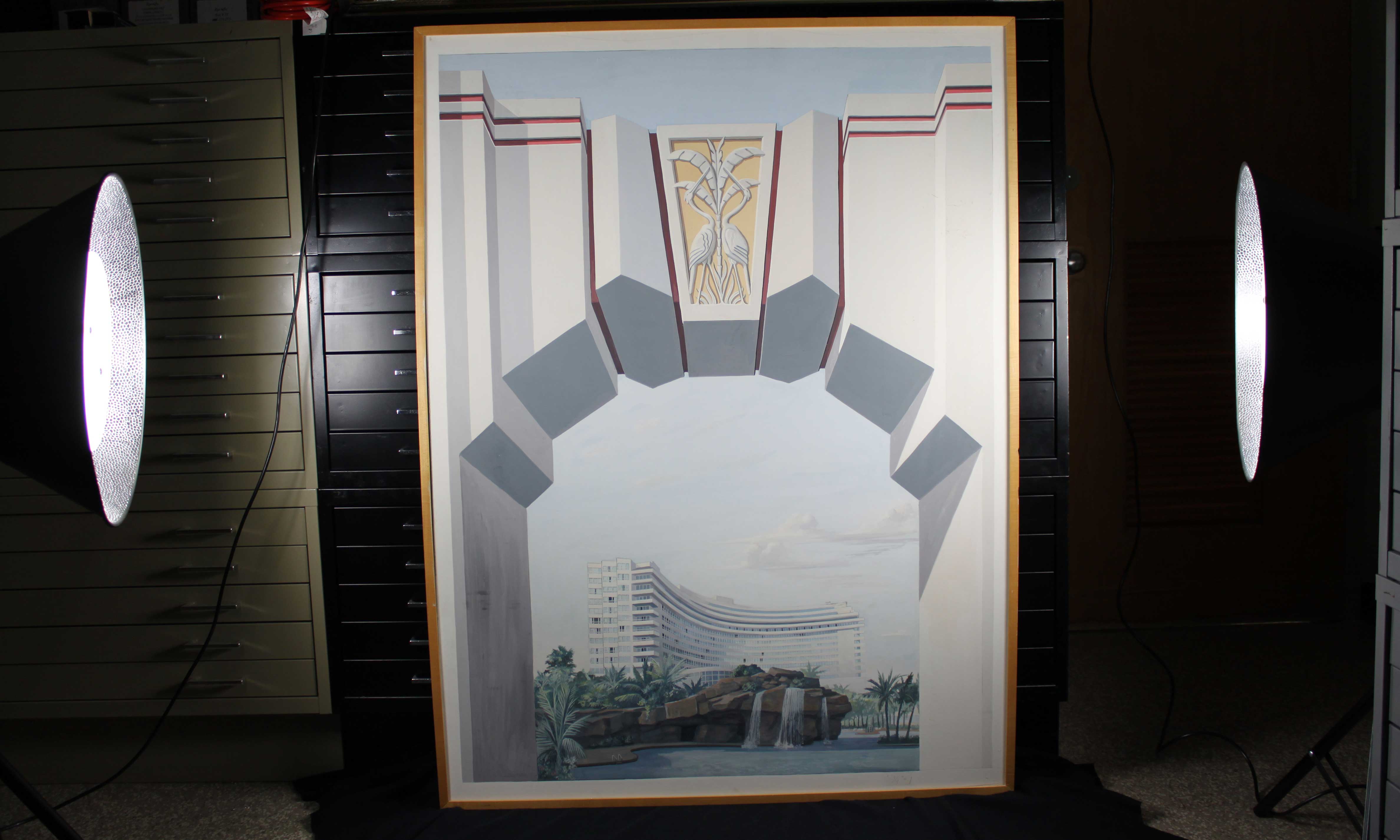 The original Fontainebleau mural design maquettes—or preliminary design sketches—for the project were recently donated to the Special Collections by the artist himself. The larger maquettes, painted in gouache on board, are quite large themselves, measuring at around four and a half by three and a half feet. Today, Haas looks back on the project fondly and describes the mural’s style as it “really related to a kind of deco meets moderne.” Haas and his patrons wanted to respect Lapidus’s original building. They wanted the rest of Miami Beach to see the majestic Fontainebleau. So they opened it up the only way an artist could: through mirage.